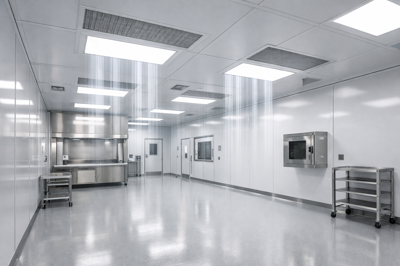 Paredes e tetos são construídos com painéis pré-fabricados, normalmente feitos de aço ou alumínio com núcleos isolados. Esses painéis fornecem superfícies lisas e herméticas, fáceis de limpar e resistentes ao crescimento microbiano. Eles podem ser montados em diversas configurações, simplificando a expansão ou modificação do layout da sala limpa.
